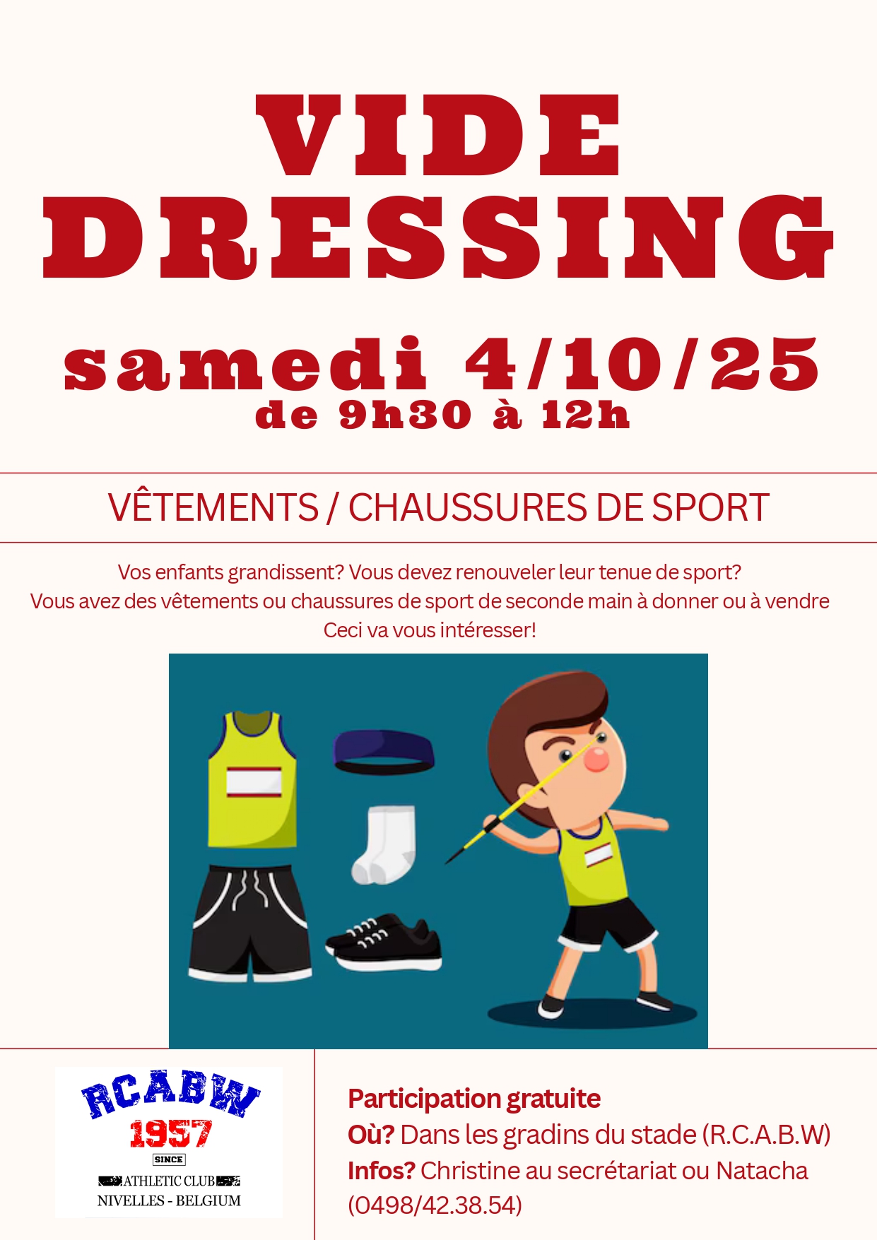 Déposez votre sac de vêtements au Club House avant le 04/10. Ces articles seront vendus à petits prix au bénéfice de l'Ecole d'Athlétisme.