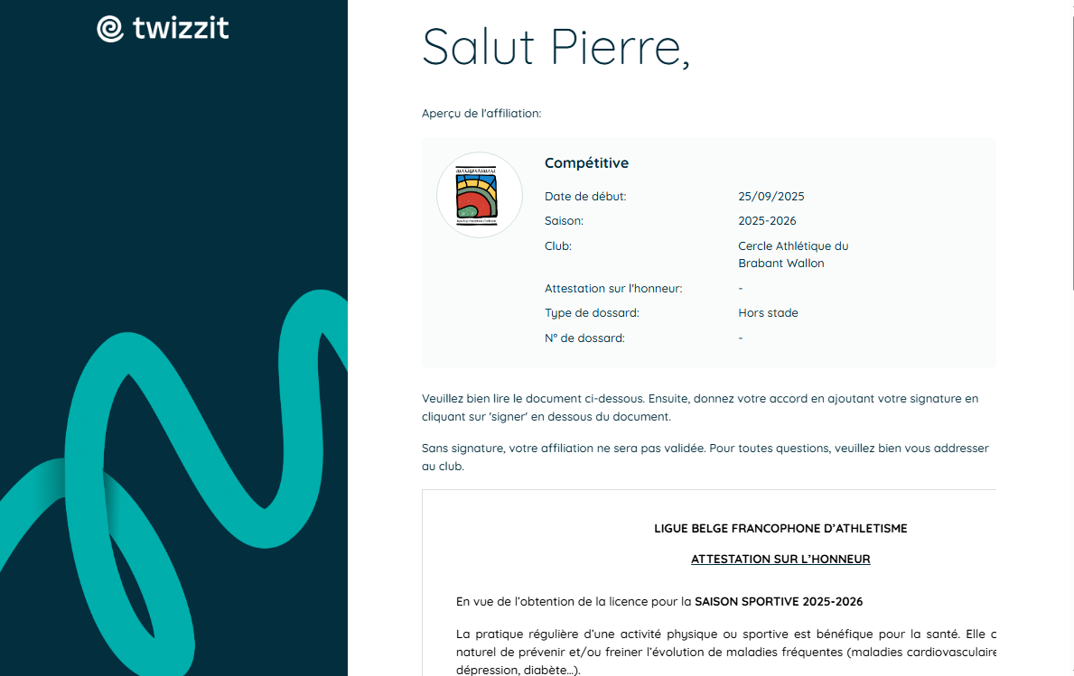 Pour tous les enfants âgés de 6 ans ou plus, la LBFA vous enverra un e-mail pour valider l'affiliation et permettre l'obtention du dossard qui :