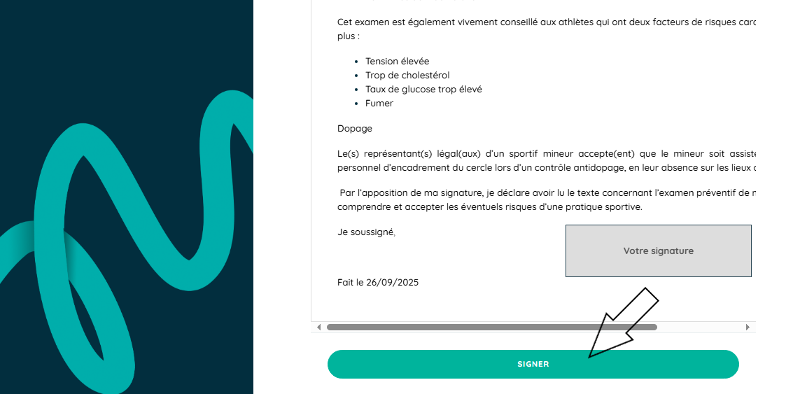 3 - Faites défiler jusqu'au bas de la page et cliquez sur "signer" et apposez votre signature dans le cadre.